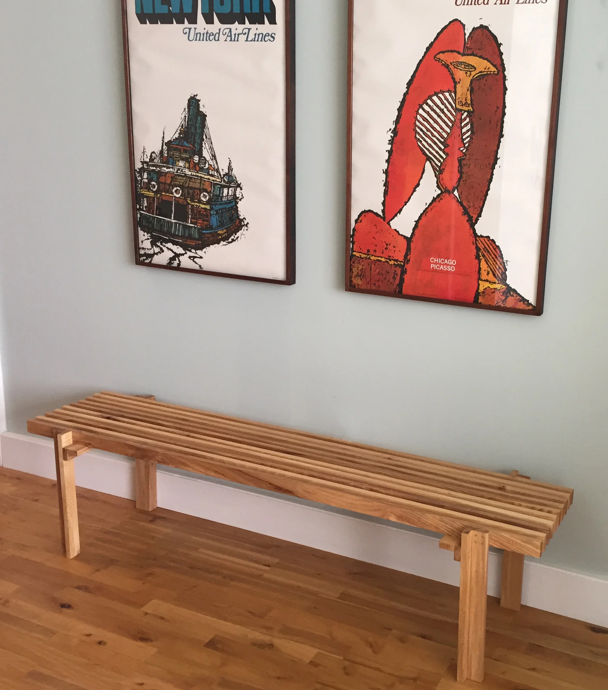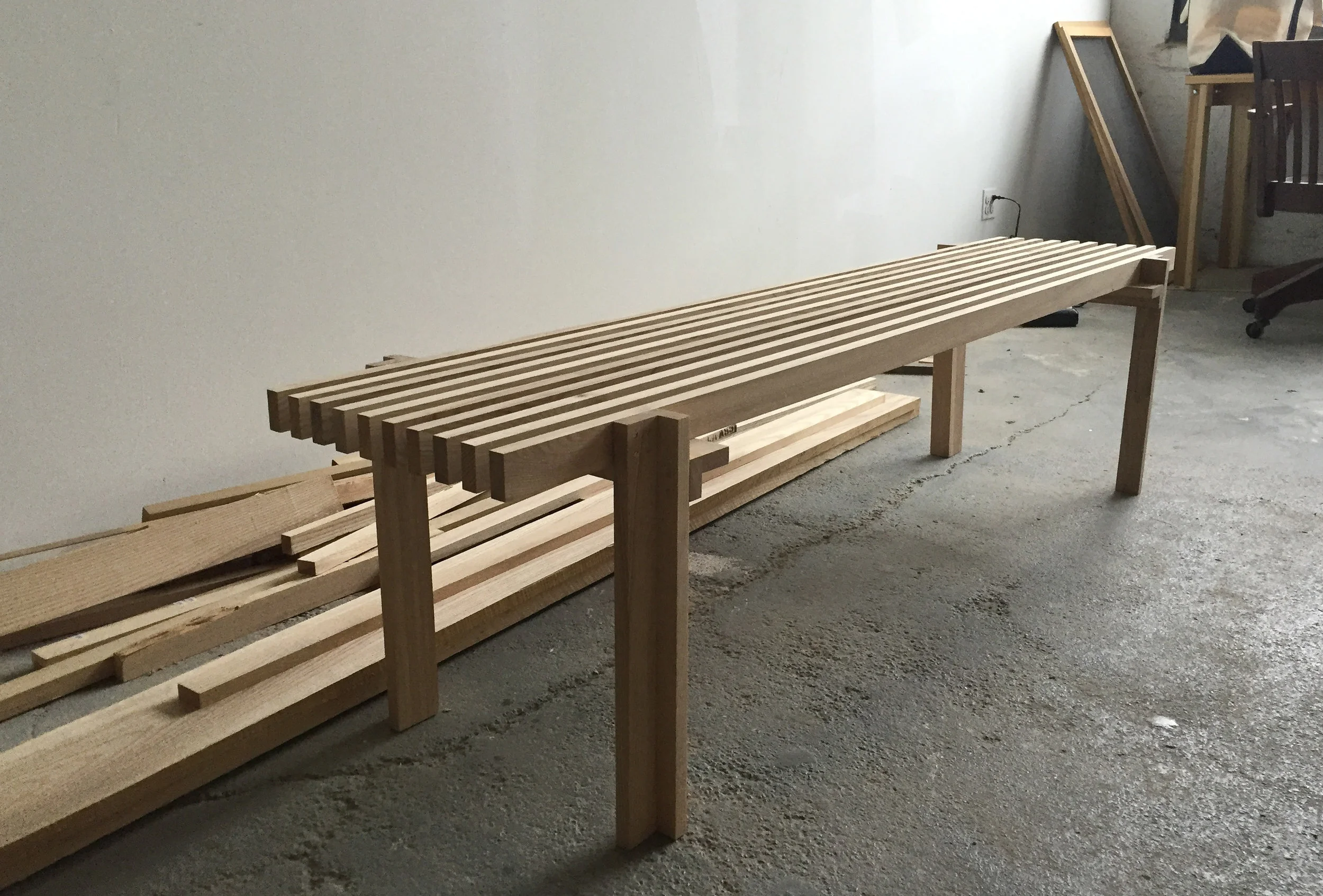 This Slat bench would ultimately be the seed from which the Column tables emerged. Like the others, every board in this design shares the same dimensions with only the length varying among the components. Similarly, the dimensions of this piece are also highly variable and the applications of this idea will continue to evolve.